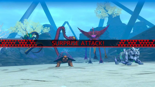 When you explore dungeons you’ll see red enemy symbols. As soon as they see you, they will pursue. If they catch you, a battle with a group of enemies will ensue and you will be at a disadvantage. If you slash them with Ringo’s sword, they will be in a downed state. At that point, you can attack and you’ll be the one benefiting from an advantageous start to the battle. Otherwise, you can leave them behind and avoid a fight altogether.