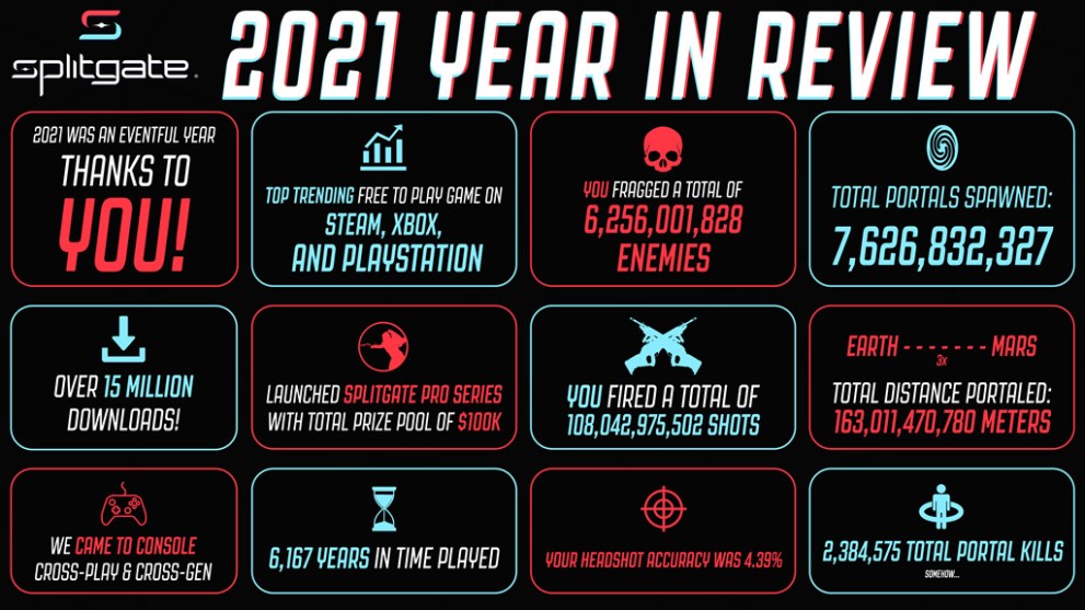To help showcase what a great year Splitgate has had, the developer has released a really interesting infographic highlighting a handful of key facts. Feel free to check out said end-of-year image down below: