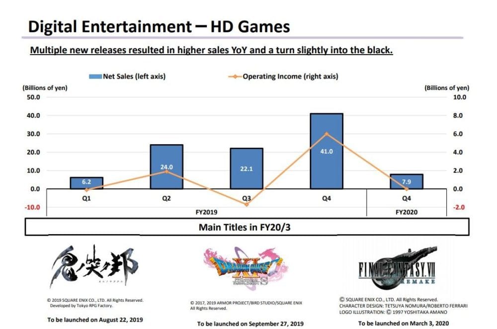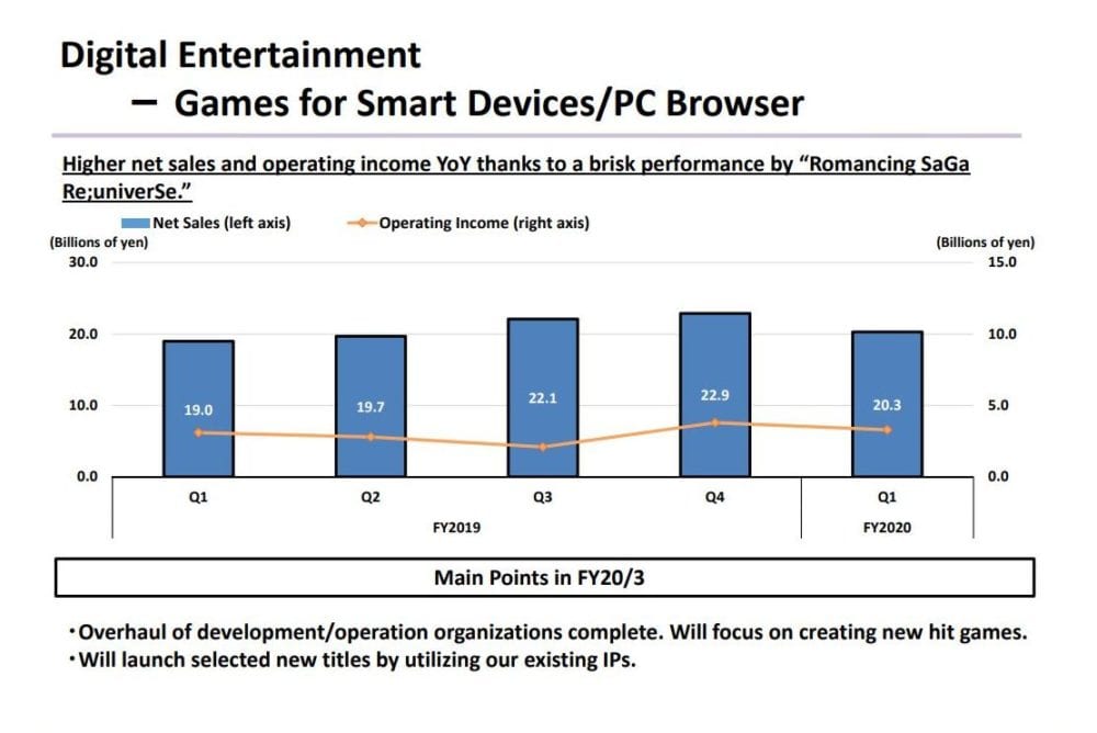 We get an explanation of the results for the digital entertainment business: while the release of new games for consoles (including the Final Fantasy games for Nintendo Switch and Xbox One) resulted in performance growth in the field, Romancing SaGa Re;univerSe for mobile performed well, increasing results year-on-year on that front as well.