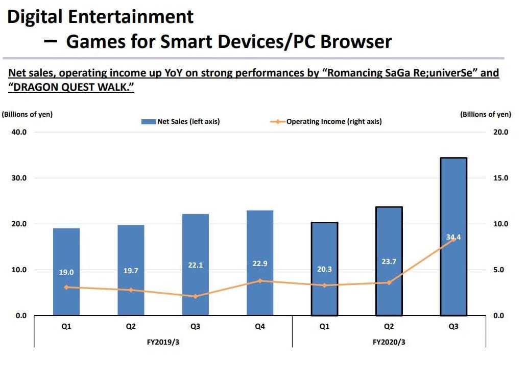 In the smart devices and PC browser area, net sales and operating income increased year on year since “Romancing SaGa Re;univerSe” and “DRAGON QUEST WALK,” the latter of which was launched in September 2019 performed well.