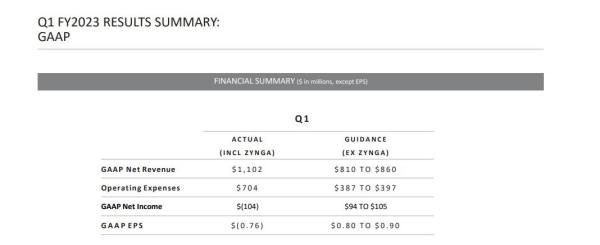 “Our Fiscal 2023 is off to a strong start, as demonstrated by our first quarter Net Bookings of $1 billion, on a pre-combination basis, our Net Bookings were approximately $731 million, and our operating results were above our expectations, as we launched engaging new games and content updates, all while navigating various macroeconomic and geopolitical factors.”