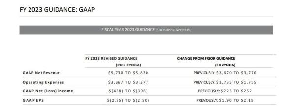 For Fiscal Year 2023, we now expect to deliver Net Bookings of $5.8 billion to $5.9 billion when including our combination with Zynga. Our pipeline for the year continues to look very strong, and we are excited to expand significantly our mobile presence with a best-in-class platform. Our new forecast takes into account some movement in our release slate for the year, foreign currency pressures, and macroeconomic and geopolitical uncertainty. As we look to the future, our long-term vision is clearer than ever, and we believe that our combination with Zynga will enable us to better capitalize on the evolving dynamics of the interactive entertainment industry. As we deliver our expansive, diverse pipeline and pursue the vast opportunities that we have identified through our combination with Zynga, we see a path to engage even greater audiences around the world, grow our scale, and enhance our margins.”