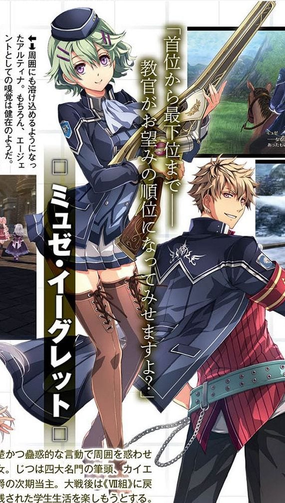 The screenshots and artwork showcase Rean himself on top of Juna Crawford, Kurt Vander, Altina Orion, Musse Egret, and Ash Carbide.