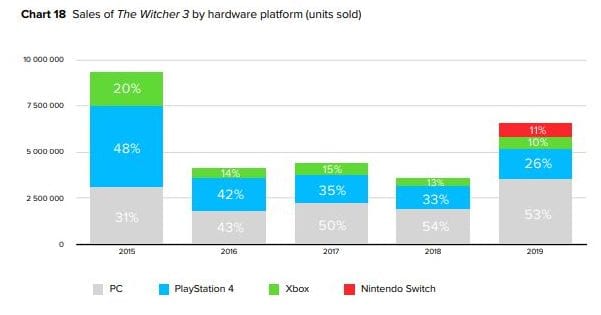 The Witcher 3 sold best in Europe, which generated 37.2% of sales in 2019, followed by Asia (27.9%) and North America (25,6%).