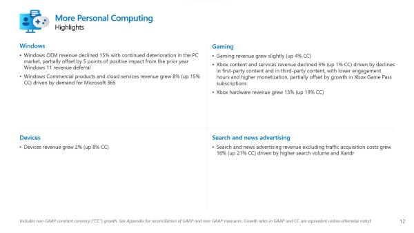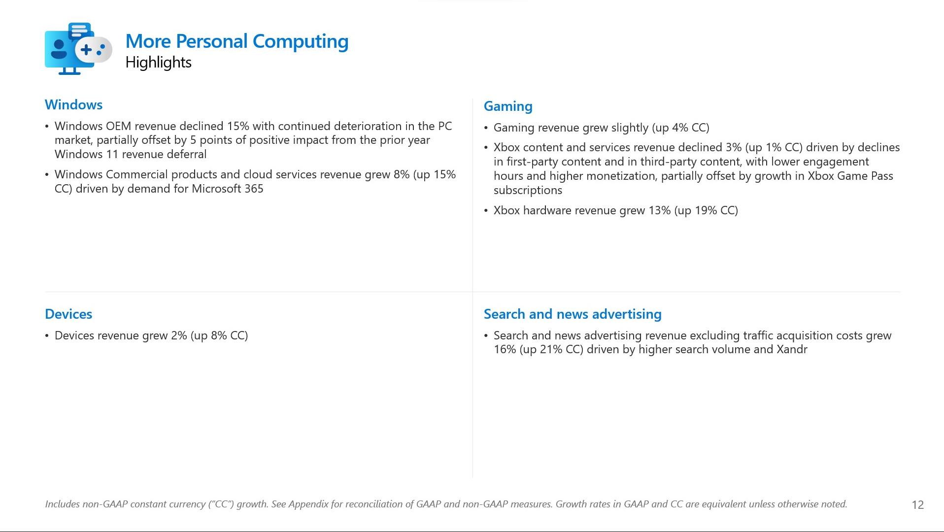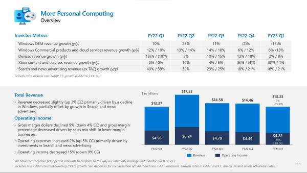 A decline in gaming gross margin is also identified as a factor alongside Windows in a 9% decline in overall gross margin for the More Personal Computing business.