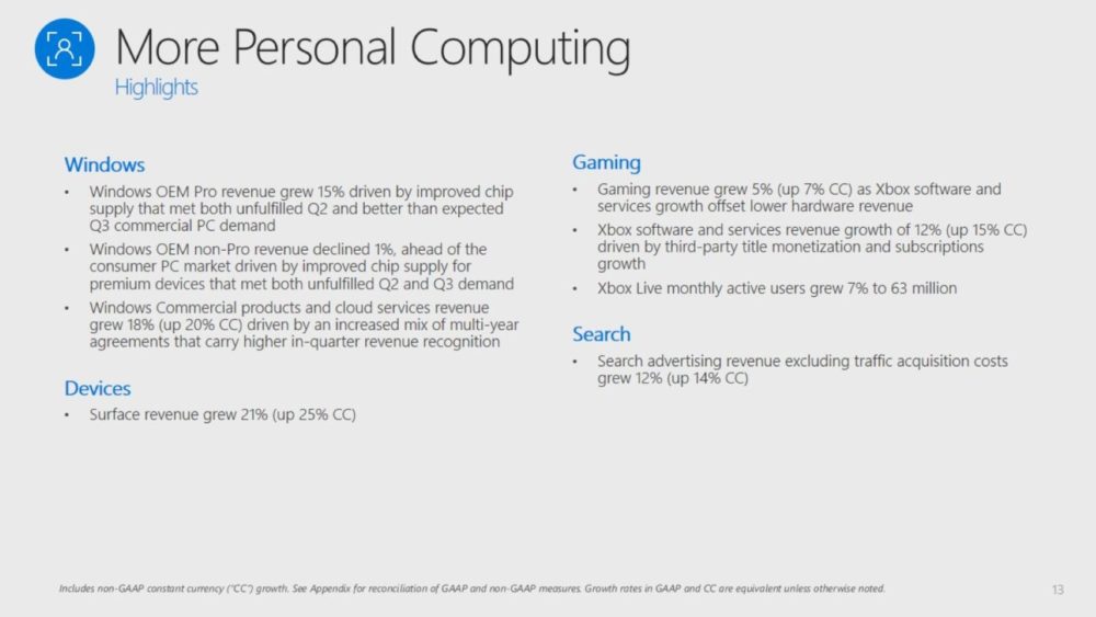 The “More Personal Computing” segment, which includes gaming, is actually the highest contributor for the quarter, narrowly beating Productivity and Intelligent cloud, even if it registered the slowest growth.