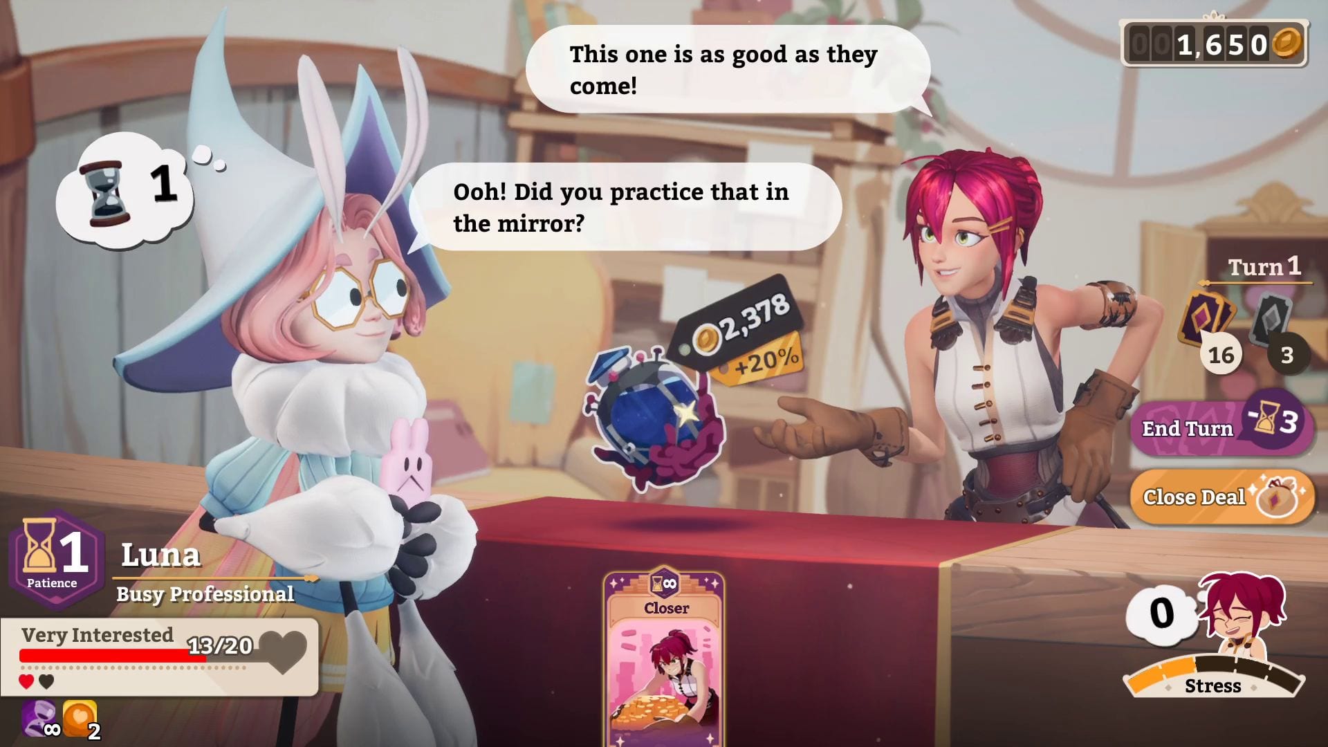 “Potionomics is a game about the business of brewing and selling magical potions. Sylvia, a penniless young witch, must save her shop from the clutches of a debt collector, but she can’t do it alone. With the help of fellow merchants, fledgling adventurers, and an overbearing owl, Sylvia will master the art of potion brewing and the nuance of salesmanship to rescue her shop.