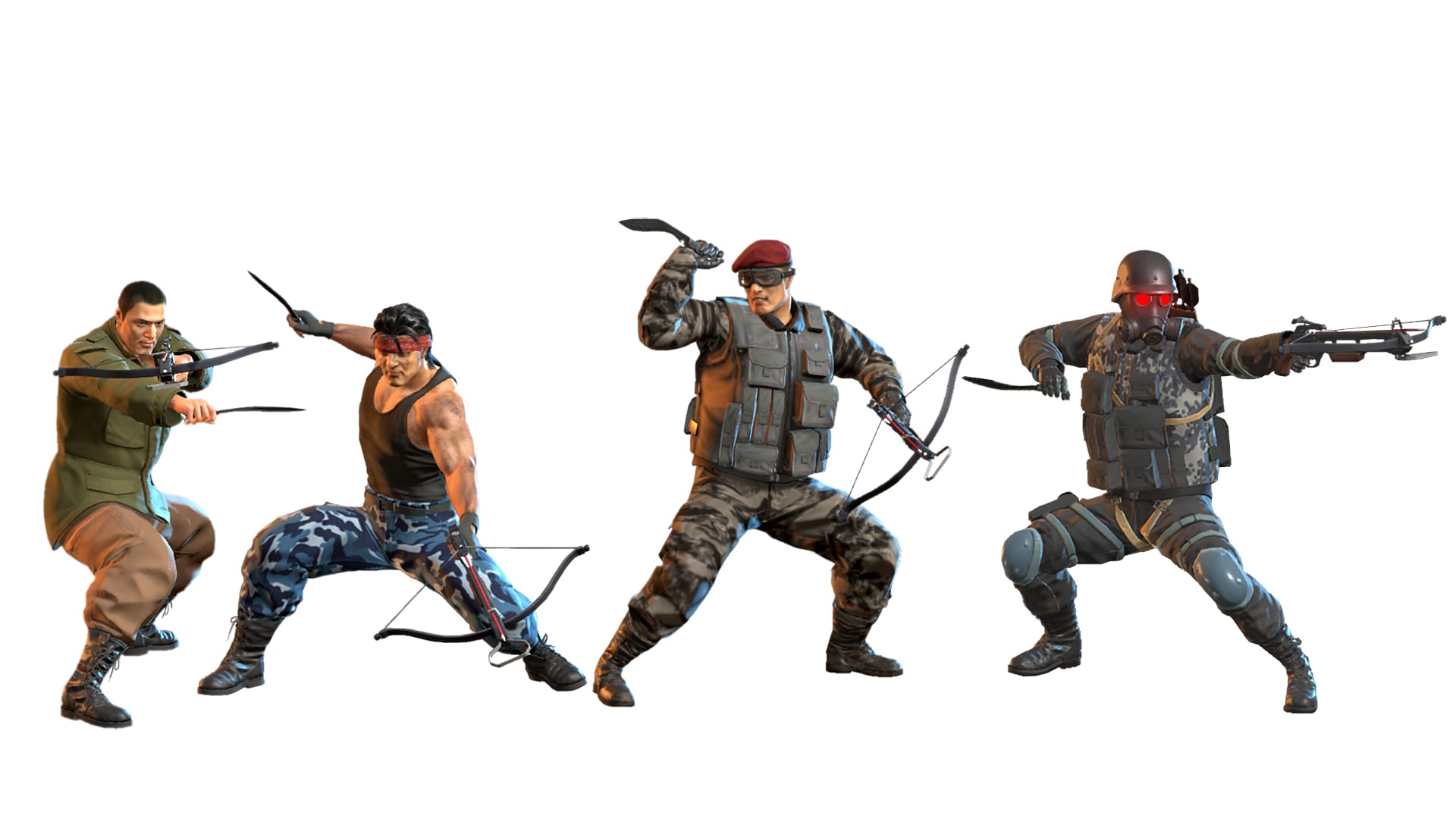 As their level goes up, they make use of weapons like knives, grenades, and crossbows. The Arminator even has mysterious eye beams.