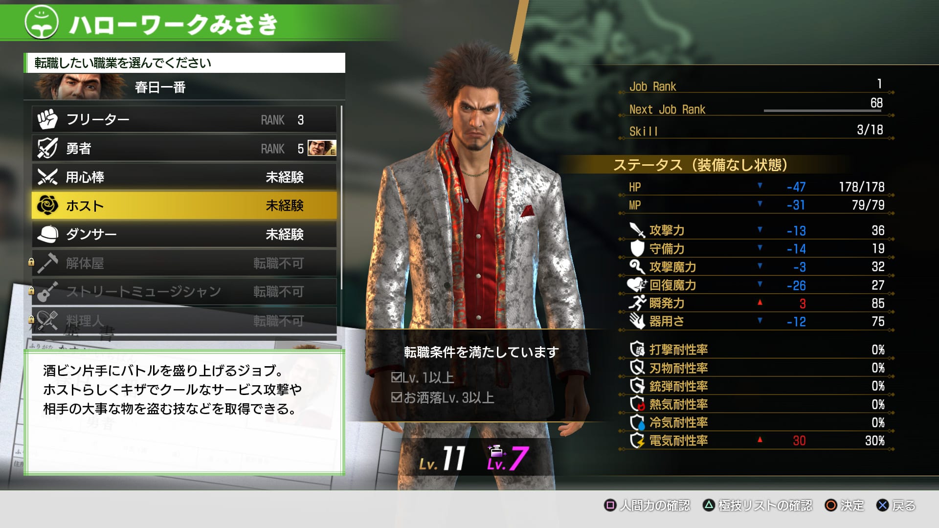 On top of that, some of the jobs you can change to have a minimum Human Score stat requirement. For instance, to become a Host you need to have your “Charm” stat at 3 or higher.