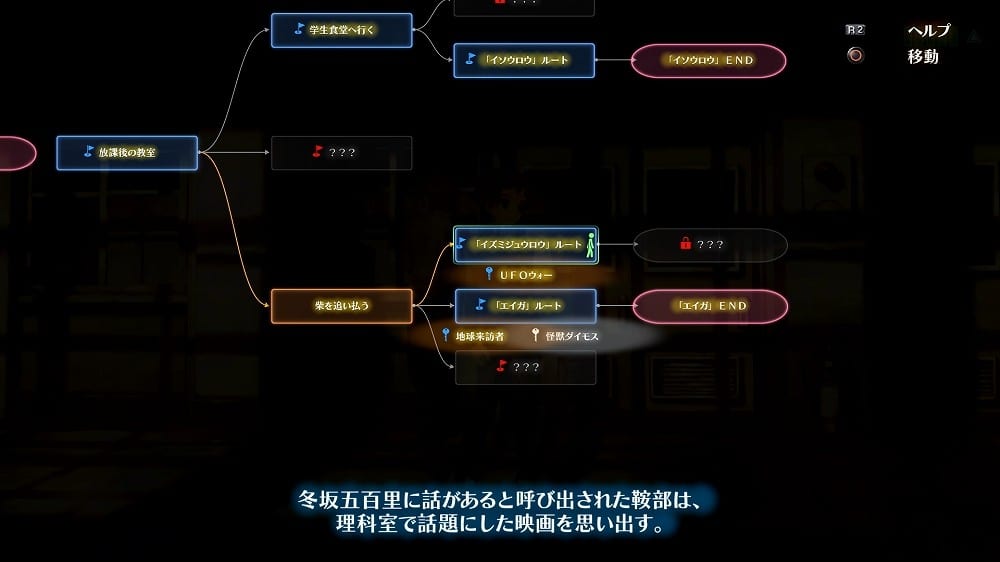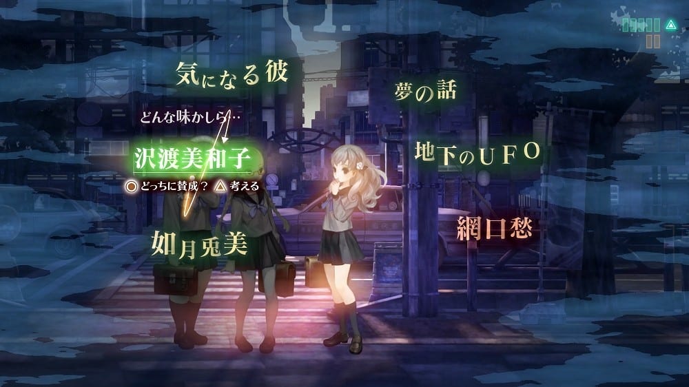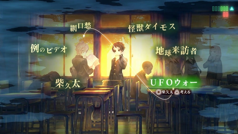 Interaction within the Cloud Sync system is done by selecting keywords that appear during conversations. Thinking lets you change them to different keywords and by saying them to other characters. This is intended to create a more natural flow compared to simply selecting options in usual visual novels.