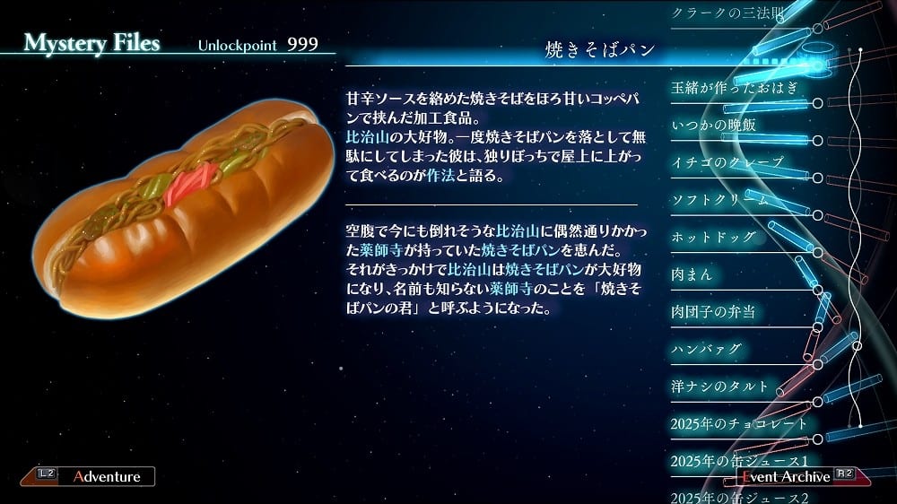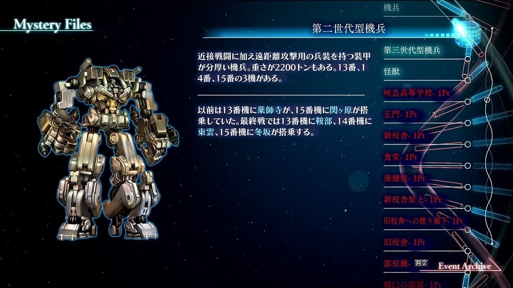 The Archives part of the game goes in-depth into the carefully created worldview of the game. It allows the player to rewatch event scenes and to check files on characters, robots, and even food. Each file is accompanied by beautiful illustrations. New files can be unlocked by using points earned in battle, and it’s also possible to unlock new episodes in the adventure part.