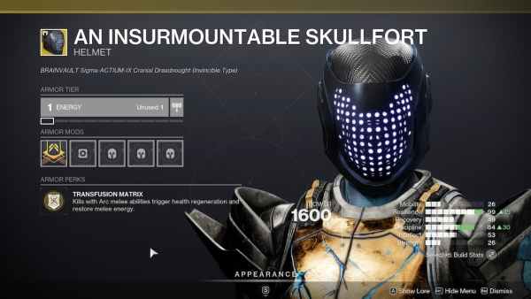 The main perk on the Skullfort is Transfusion Matrix. This means that kills with Arc melee abilities trigger health regeneration and restore melee energy. This is a huge amount of fun in less challenging content where melee kills are so easy to find, but it falters pretty hard in more difficult content.