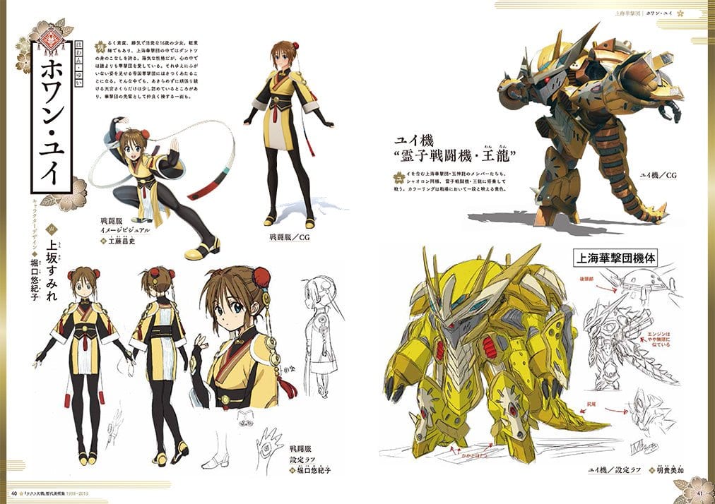 In the first page we get to see Huang Yui from the Shanghai revue and her mecha, created by K-On! and Lucky Star Character Designer Yukiko Horiguchi. Her mecha was designed Mika Akitaka, well-known for the mecha design of Gundam ZZ , Mobile Suit Gundam 0083: Stardust Memory, Martian Successor Nadesico, and Galaxy Fraulein Yuna.