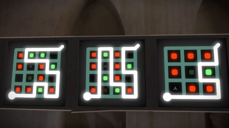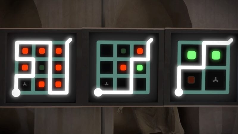 This will power the next platform (take the high road on the switch), and lead you to the stone building’s challenging puzzles. Keep in mind the rule of the asterisk. Colors should be in pairs, so you’ll need to keep a lone green with the asterisk, within the puzzles. Here are the solutions: