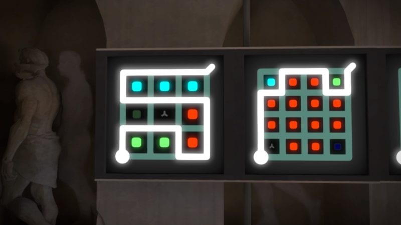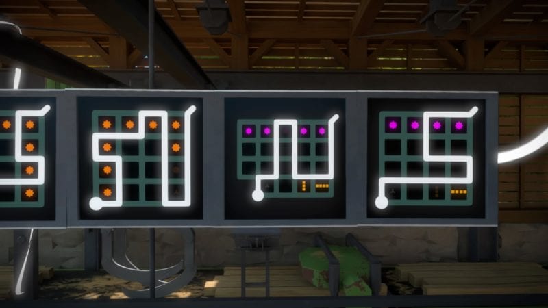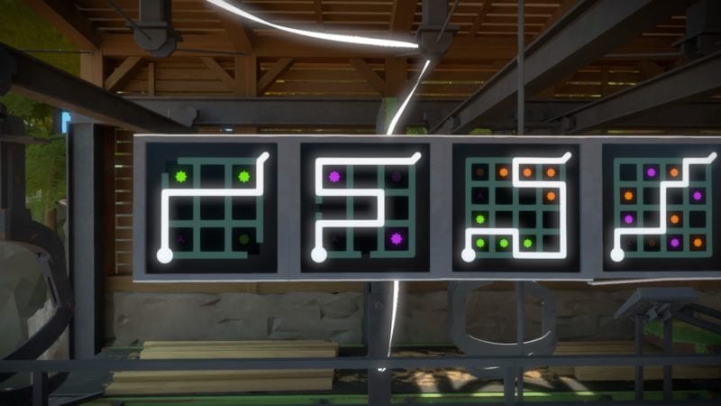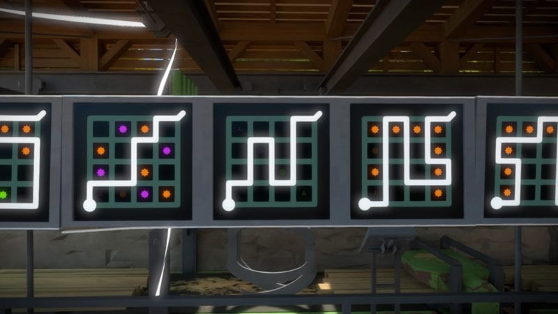 Do not let the simplicity of the door’s puzzles fool you though. The Witness can be quite deceptive at times. The puzzles within have an entirely different rule-set, so lets get into those. When you enter you’ll need to use the conveyor belt to get to the upper level. The solutions is: