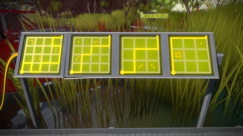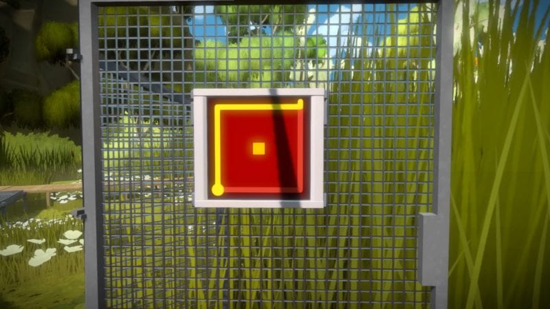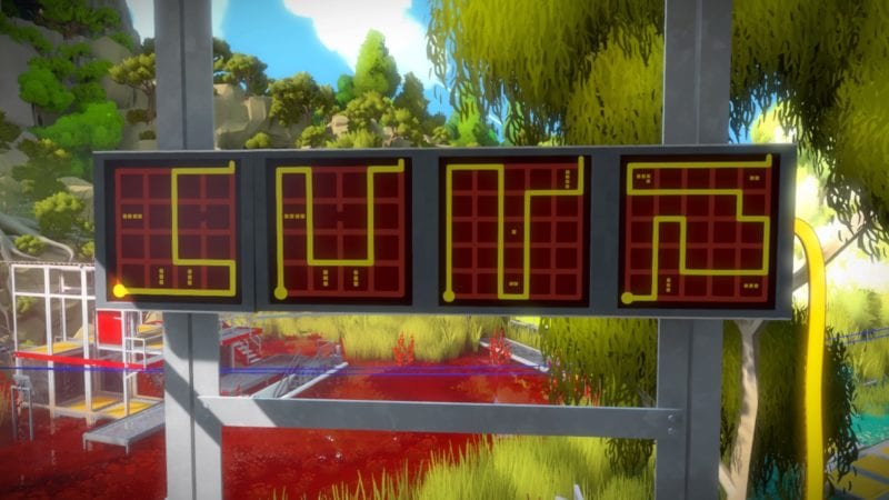 Solving the previous set of puzzles will allow you to go down the stairs near the beginning of the marsh area, just after the first moveable platform. See the solutions below. After, head to the stairs just before the ‘L’ shaped platform. This will open up a door on the other side of the room to a red structure – the final part of the marsh area.