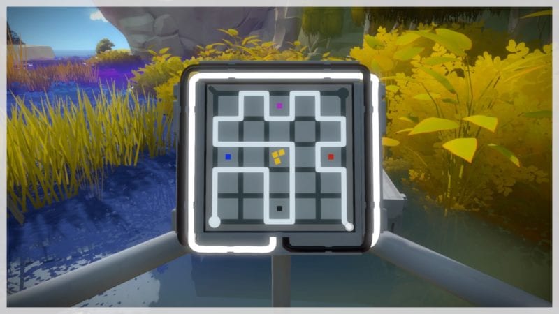 Next, head forward past the steps to a set of puzzles on your right. These are slightly trickier, so see the solutions below. After you have completed them, continue on towards the dock. When you get to a fork in the path, take the one furthest to the right until you see a puzzle on the ground. Then, head back the the stairs that go underground by the ‘L’ shaped platform. Here, you will see five puzzle with yellow and blue shapes. The rule here is that blue squares eliminate yellow squares in the shapes you are attempting to draw round the puzzle. Don’t forget that the previous rule still applies.