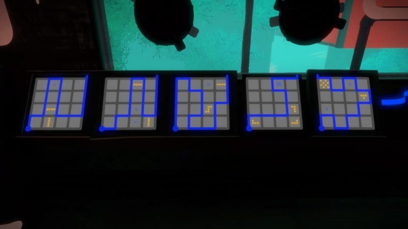 Next, head forward past the steps to a set of puzzles on your right. These are slightly trickier, so see the solutions below. After you have completed them, continue on towards the dock. When you get to a fork in the path, take the one furthest to the right until you see a puzzle on the ground. Then, head back the the stairs that go underground by the ‘L’ shaped platform. Here, you will see five puzzle with yellow and blue shapes. The rule here is that blue squares eliminate yellow squares in the shapes you are attempting to draw round the puzzle. Don’t forget that the previous rule still applies.