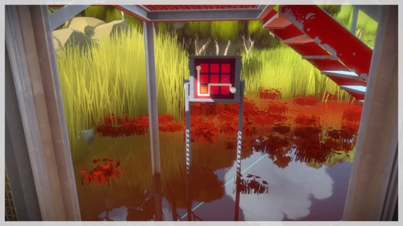 Solving the previous set of puzzles will allow you to go down the stairs near the beginning of the marsh area, just after the first moveable platform. See the solutions below. After, head to the stairs just before the ‘L’ shaped platform. This will open up a door on the other side of the room to a red structure – the final part of the marsh area.