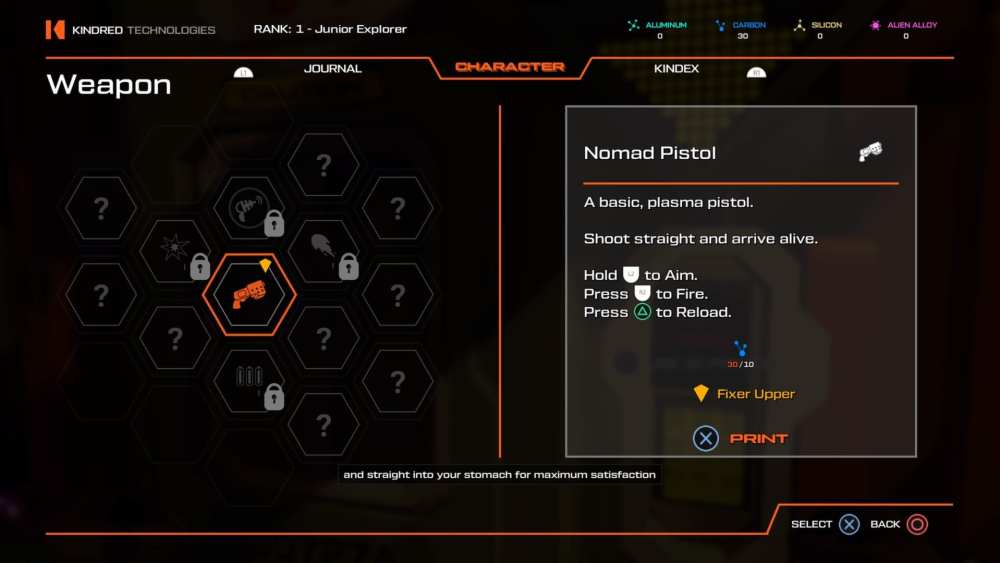 Problem is, you’ll start off this little escapade with very little. Your ship’s AI will make frequent hilarious quips, and that’s about it. Over time as you explore the planet and get busy scanning everything you can possibly see to catalog it, you’ll acquire crafting materials that can be used to unlock upgrades and abilities via the 3D Printer on your ship.