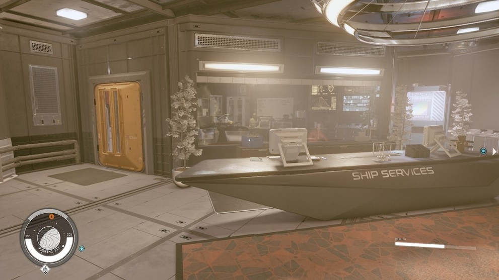 Inside is an actual reception area with a desk that says Ship Services, but to actually find the technician, you will have to go into the office and speak to Lon Anderssen. It’s a little strange that this is the only technician with an actual name. However, the oddities stop there as otherwise, this place offers the expected upgrades. Though there are also seven ships here to purchase, so at least one might stick out as worth the massive price.