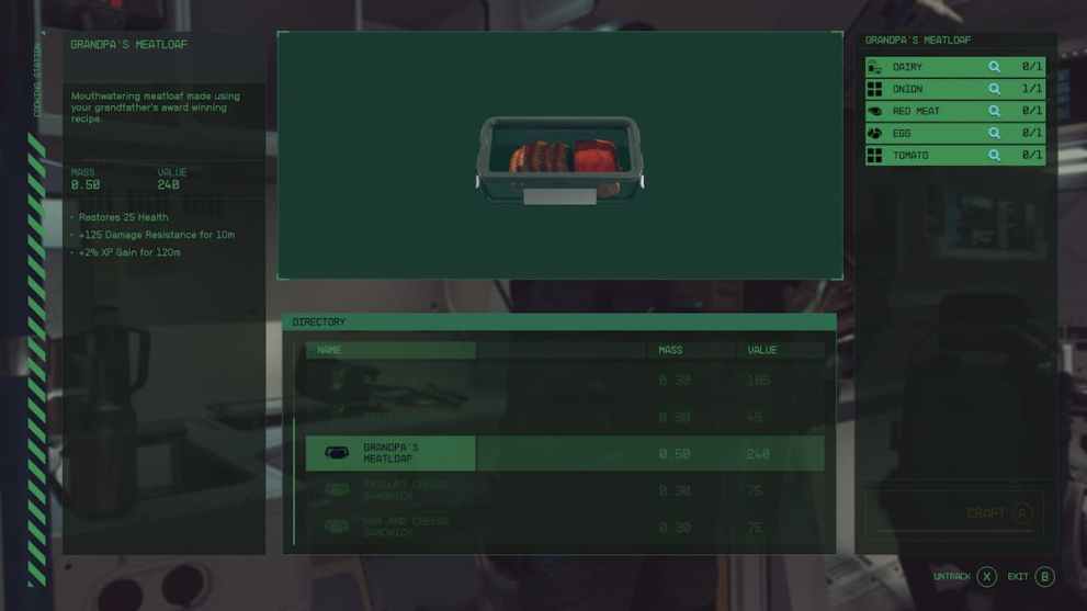 Once you collect the ingredients, go to a cooking station (you can find one on your ship or other locations) and select ‘Grandpa’s Meatloaf.’ Players may need the Gastronomy skill to access it, permitting you to craft specialty food and drinks. You can learn about other recipes by conducting more research or completing various missions.