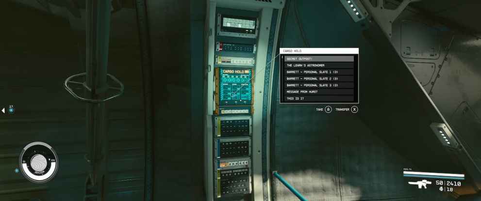 Where the cargo hold is situated depends on your spacecraft’s design. However, we largely found cargo holds just behind the cockpit. Once you’re looking directly at it, you can press X to transfer items to and from the cargo hold. This brings up the typical inventory menu that you see when you open your own inventory. In this menu, however, you’ll be able to manage your cargo’s inventory instead of your own.