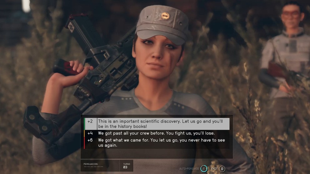 Bribing is technically the easiest option because you don’t need to pass the persuasion mini-game. However, you will lose 4,000 Credits, and she still acts quite unpleasant towards you. I don’t recommend this route unless you have a lot of cash to spare.