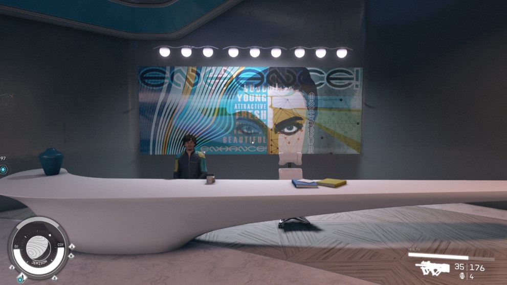 - Location: While it’s plastered on ad signs across the entire city, Enhance! is located in the Commercial District, between Infinity LTD and the Outland Shop. It doesn’t have a sign on the outside of the building, so make sure you don’t overlook it.