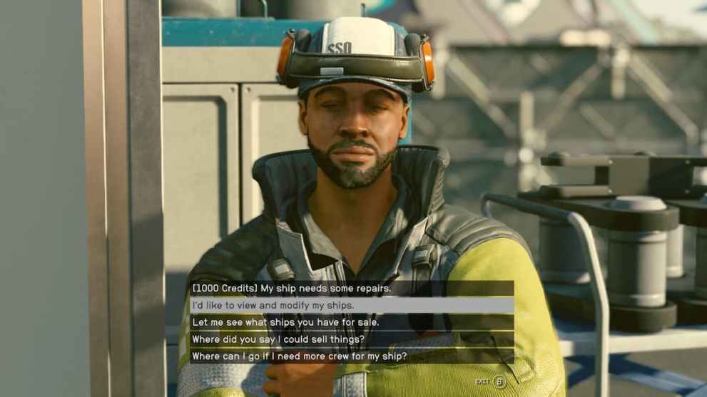 Once you’ve tracked a Ship Services Technician down, speak to them and choose the dialogue option “I’d like to view and modify my ships.” From there, you’ll be able to see the spaceships that you own in the ship overview menu.