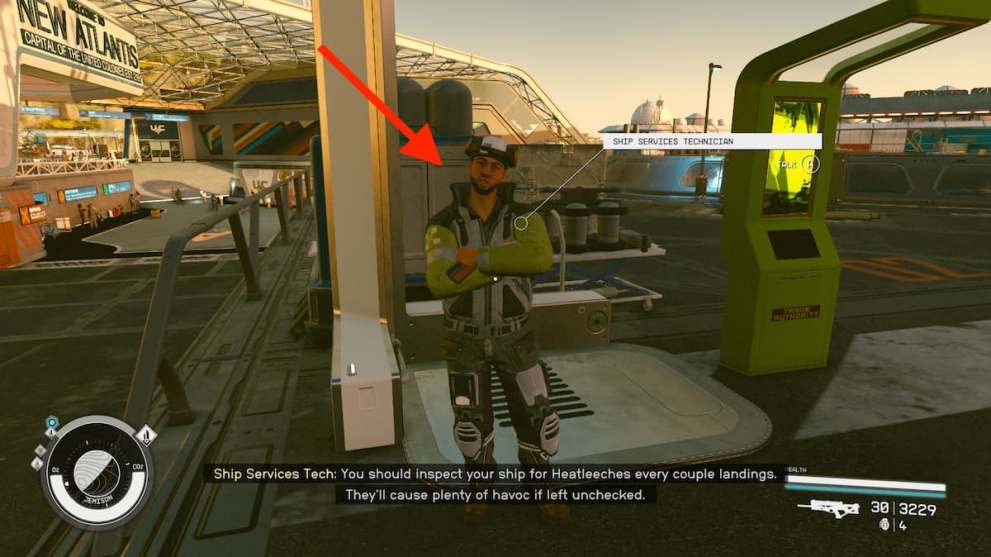 First of all, you’re going to want to visit a Ship Services Technician, who can be found in space ports in major cities like New Atlantis on Jemison, Cydonia on Mars, Akila City on Akila, and Neon on Volii Alpha. They usually wear the same yellow uniform (as pictured below).