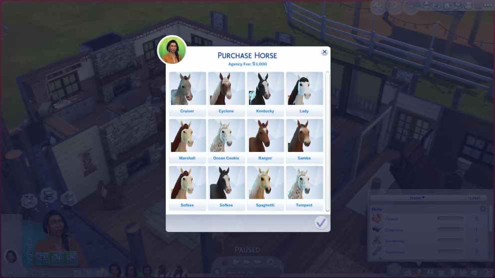 Horses can go for 1,000 Simoleons through the standard purchasing method, but you can rescue them for 250 Simoleons. If you are out and about, you can visit a nearby location like the New Appaloosa’s Equestrian Center and browse the selection to find the perfect animal companion. Those who prefer to stay home can immediately get a horse with the Ranch Animal Exchange, where you can acquire other companions like Mini Sheep and Mini Goats.