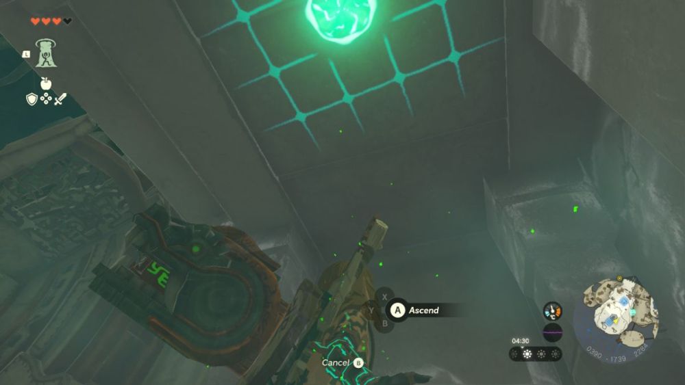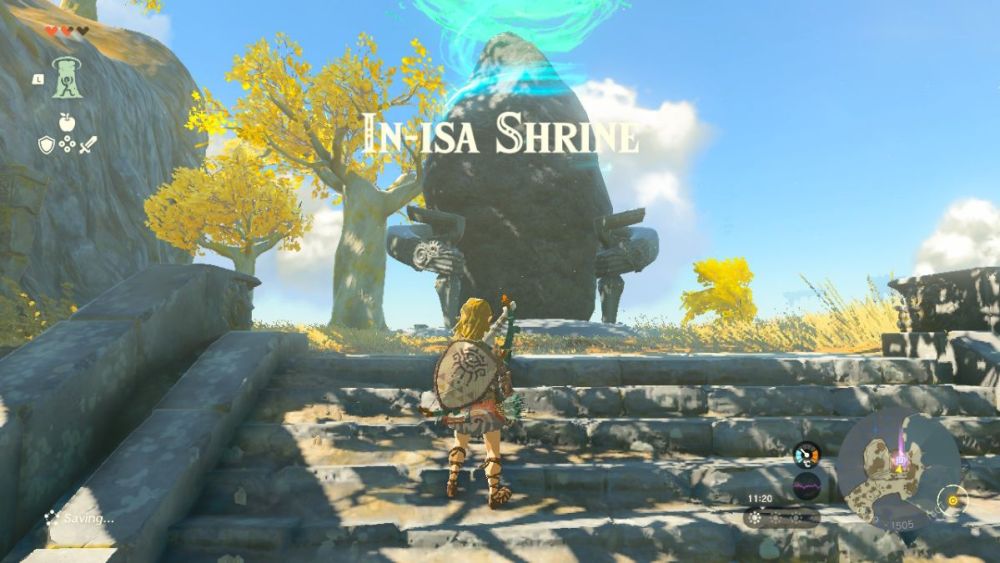 From Gutanbac, I headed toward In-isa Shrine, collecting many materials and having fun exploring as I went. As I climbed to new heights with the Ascent ability, it became pretty easy to see the swirling green light of the Shrine in the distance, so I headed in this general direction and soon found myself at In-Insa Shrine, where I learned how to use the Fuse Ability.