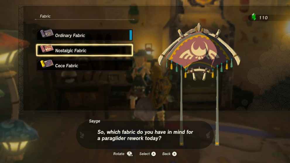 Those who are missing the features of Breath of the Wild can equip this Nostalgic Fabric to the Paraglider to take a trip down memory lane. Dedicated fans will notice a familiar pattern akin to Link’s previous mode of transportation in BOTW, depicting the same symbol at its center.