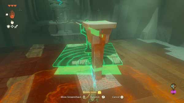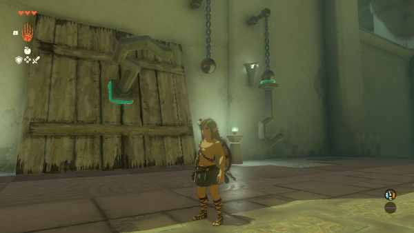 Now, move further into the Shrine, and you will find a large wooden platform resting against the wall on the left between two torches. On the ground beside it is a hook. Pick up the hook with Ultrahand and attach it to the platform right in the center.