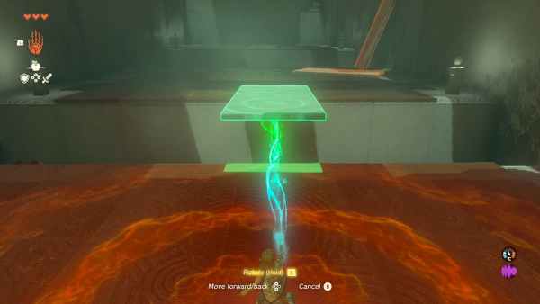 To the left, you will find a large metal railing that should remind you of a zipline. Using Ultrahand, place the platform so that the hook latches onto the zipline. Now, when you let go of the platform with Ultrahand, quickly jump on top of it because it will go sliding across the metal railing to the other side.