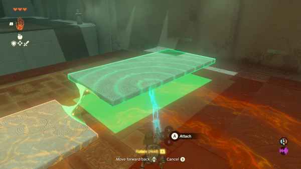 Walk across the gap, and you will find two more slabs of stone, and it is time to learn about Ultrahand’s Attach ability. Lay one of the slabs on the floor, then pick up the other, holding them end to end. The Attach option will appear, along with a line of green energy connecting both slabs. This shows you where the items you are holding will fuse together. Hit A to attach them into one long slab.