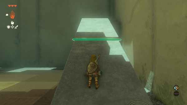 When you cross the second gap, look directly to the right in the corner, and you will see a chest sitting atop a stone plinth. This one is not exactly hidden the same way others will be in late Shrines, but keep in mind that this is essentially a tutorial Shrine. Grab the long slab from behind you and use it as a ramp to get to the top of the stone plinth. Interact with the chest to open it, and you will be rewarded with some Amber.