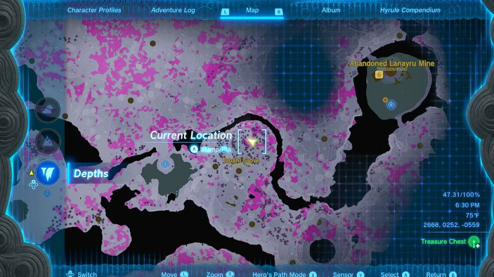 Once you land in the Depths, you can head east until you reach the Sekioam Lightroot. Your next objective is to locate a massive hollow tree stump in the Tabahl Groove, and you can see this place on the map in the form of a large white circle.