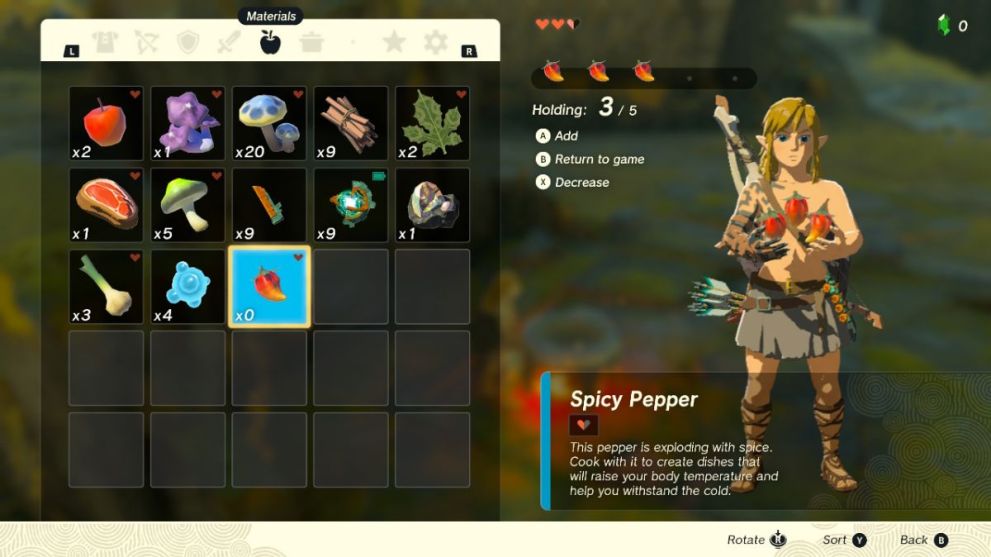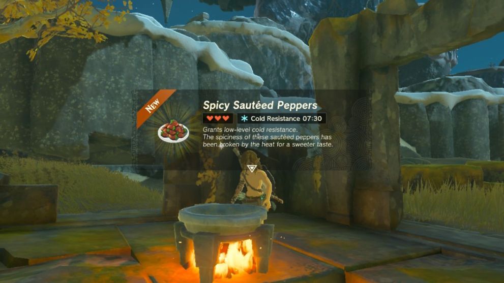 Head back into your inventory and scroll to the Food tab. Now select Spicy Sauteed Peppers, and select it to bring up the mini menu. From here, click Eat, and Link will consume the dish, immediately gaining the much-needed Cold Resistance.