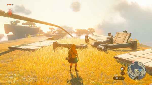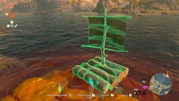 Grab the sled and transfer it to the next zipline to make your way down to an area below with lots of trees. Make your way along the new area to the east, and you will come to the components that you need to make a boat lying on the ground. Use Ultrahand to attach four logs together, then stick a sail in the middle of them to form a crude boat. Place the boat in the water and jump on top of it to make your way across the water to the Shrine.