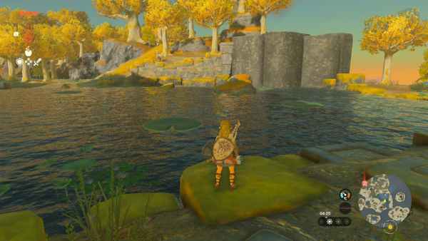After crossing back over the floating platform to the main area, you will see a stone bridge crossing some water. To the right, in the pond, is a large outcrop of rock with a grey stone on top of it. Make your way over there and lift the stone to find a hidden Korok Seed.