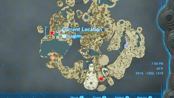 Continue to make your way toward the pin, and you will be likely to run into a couple of characters that need some help. You can see both their locations marked above. These Great Sky Island Koroks need help to reach their friend. You can take the time to follow our linked guide should you wish to help them out.