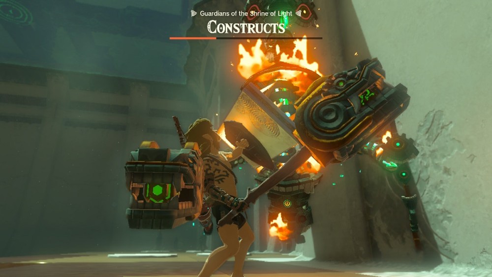 The Captain Construct at the top wields a Flame Emitter club. I found the best strategy to be landing a critical strike with the bow and getting in close to melee. If you’re within hugging distance, its weapon won’t touch you.