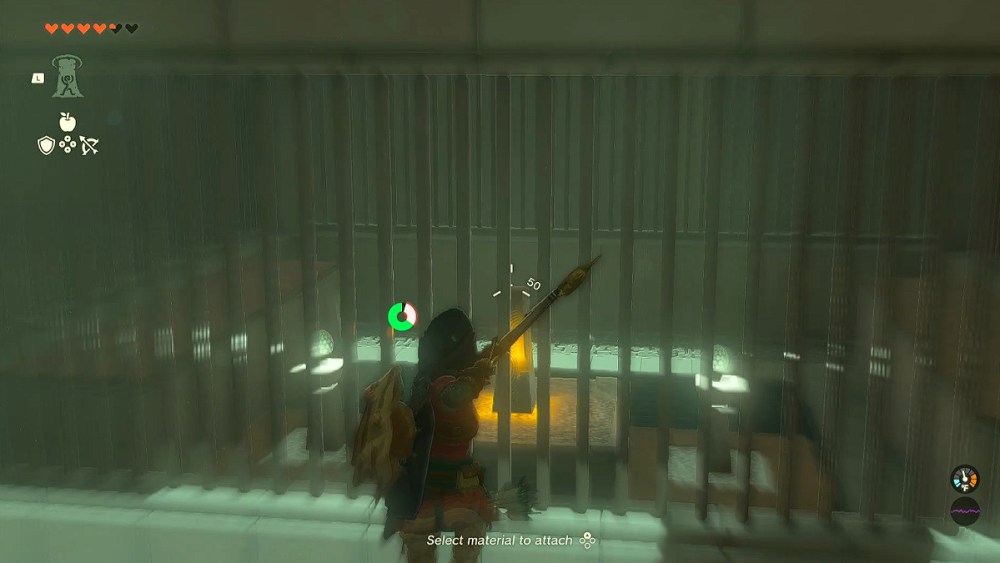 When you enter the Mayaumekis shrine, your path will be blocked by several thick metal bars. Luckily, the switch is nearby, but it is located inside the other room. The only way to progress is to hit the device using an arrow.